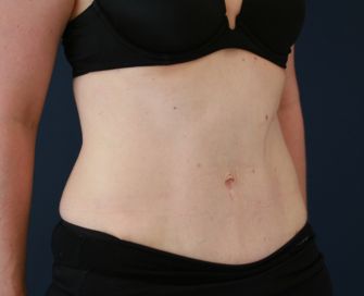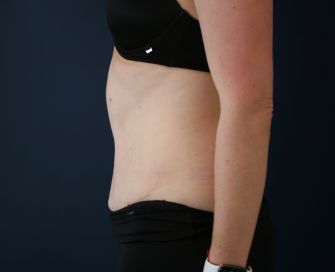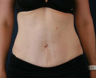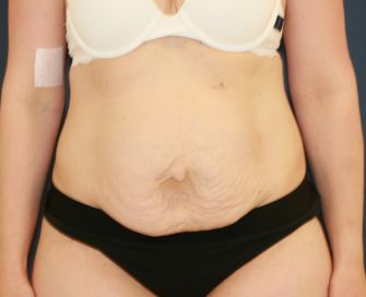 Mother of two with belly button (umbilical) hernia developed during pregnancy, muscle separation, abdominal weakness and bulge with stretch marks and loose skin. Photos before and many months after tummy tuck with umbilical (belly button) hernia repair.